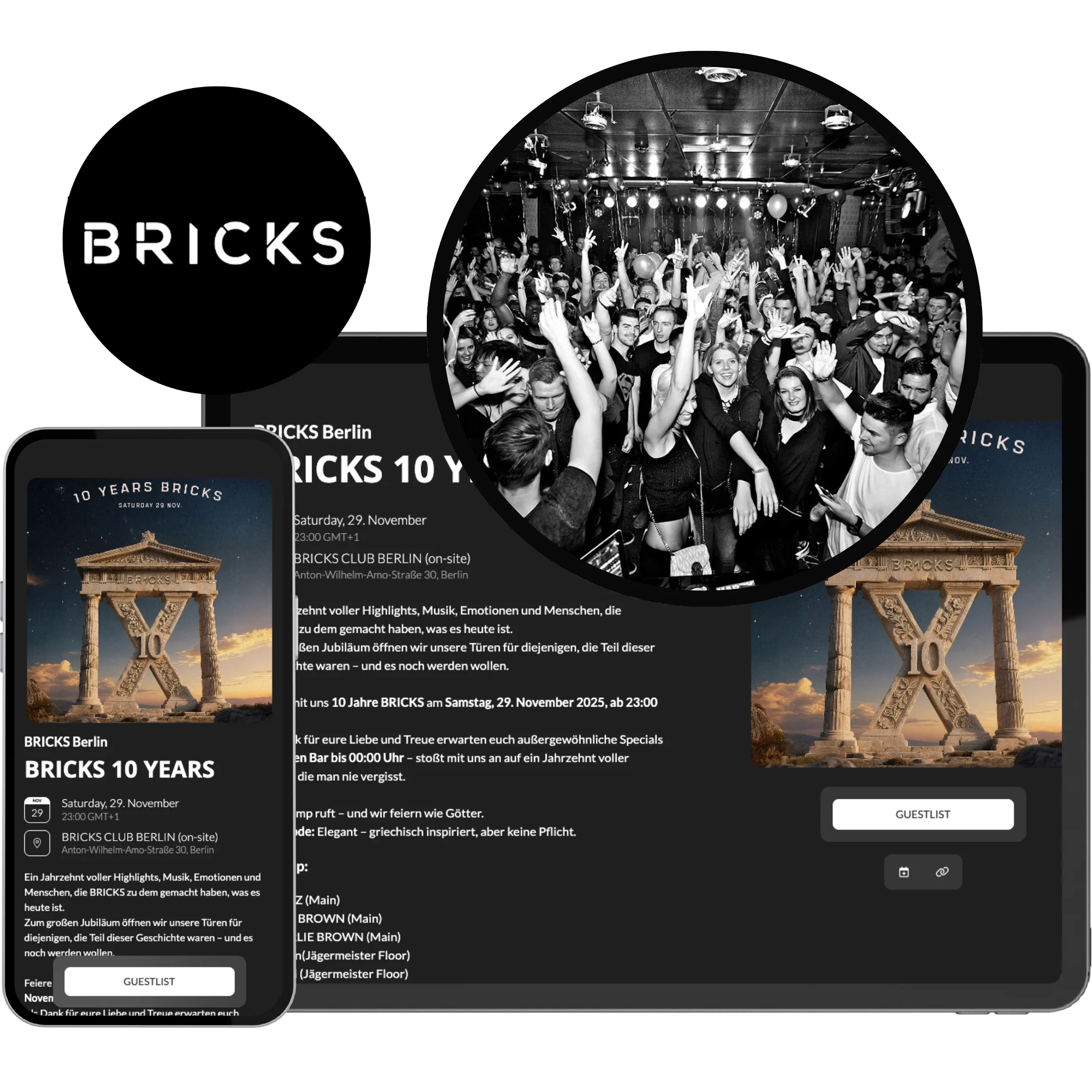 With clubpage.ai powered by eventpage.ai, BRICKS Berlin replaced fragmented tools with one integrated platform for guestlist management, QR check-in, and analytics.