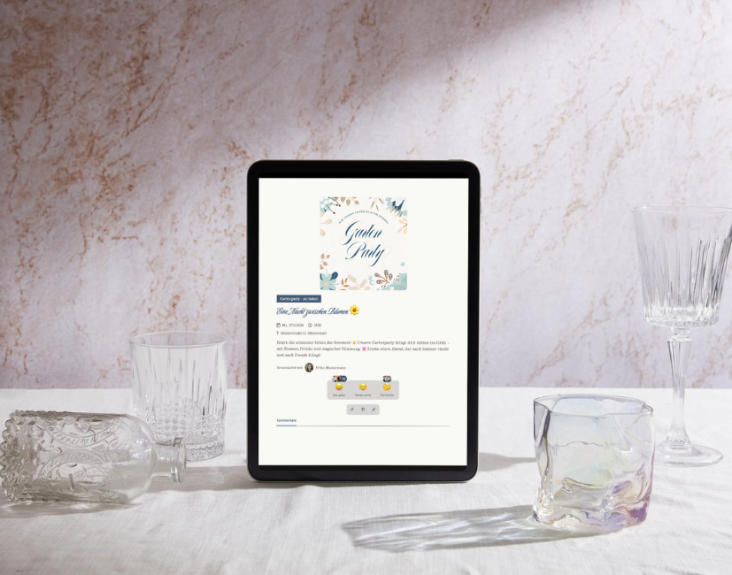 Unser intuitives Design-Tool ermöglicht es dir, ohne Vorkenntnisse einzigartige Einladungen zu erstellen. Lade deine eigenen Bilder hoch, nutze unsere vielfältigen Effekte, Filter und Texttools, um deiner „Einladung Gartenparty Vorlage kostenlos“ eine persönliche Note zu verleihen. Bei eventpage.ai sind deine Gestaltungsmöglichkeiten grenzenlos.