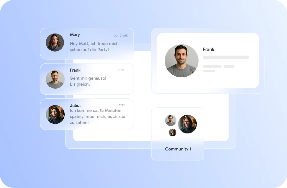 Förder echte Beziehungen innerhalb deiner Community. Biete deinen Mitgliedern einen Ort, um sich zu vernetzen – von Mitgliederverzeichnissen und 1:1-Nachrichten bis hin zu Gruppenchats und smartem Matching. Mitglieder können Profile erstellen, Interessen teilen und direkt mit anderen interagieren.