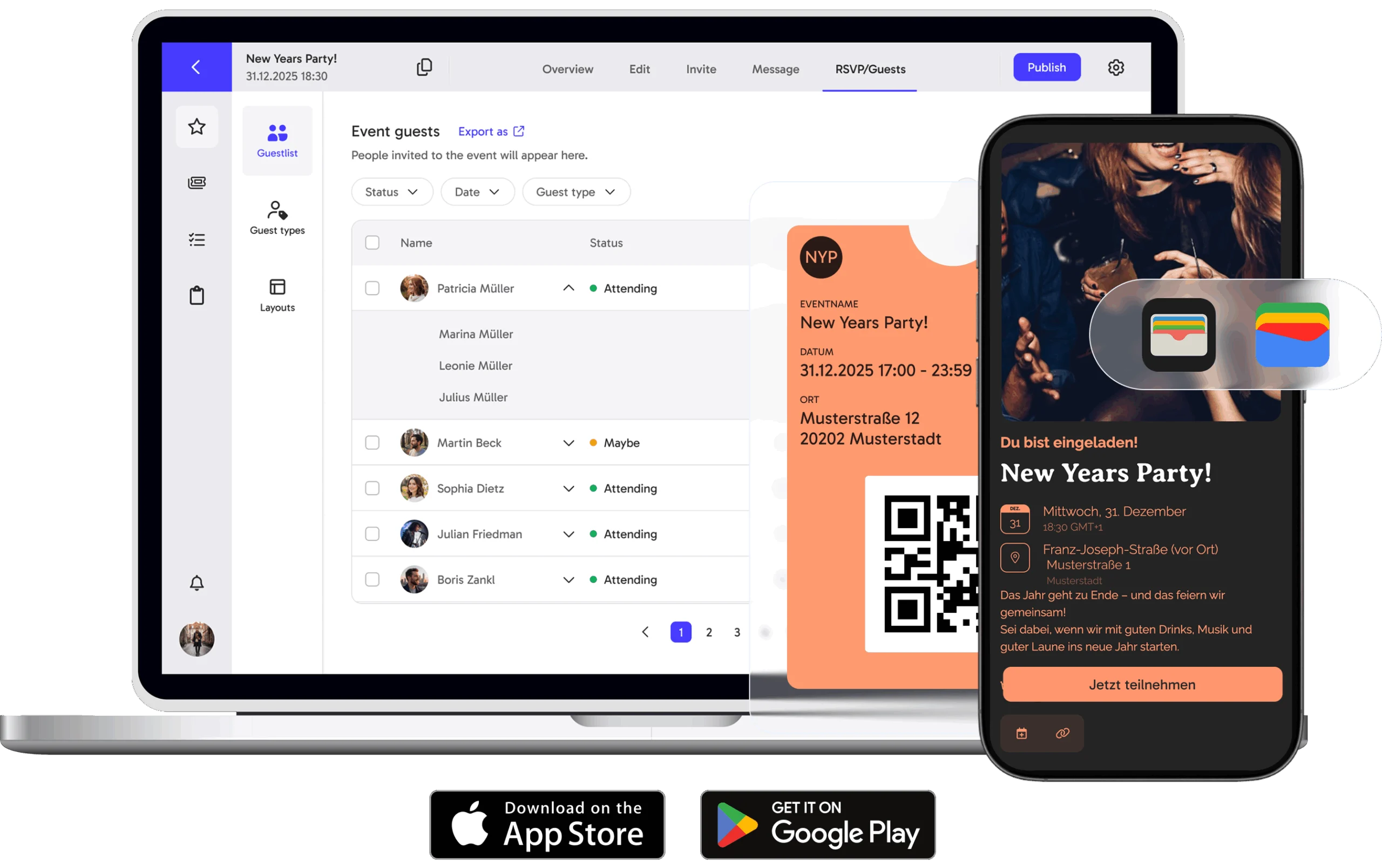 Dank Wallet-Pässen, QR-Codes, +1-Management und mobiler App – kein Drucken, kein Nachsortieren, kein Stress beim Einlass.